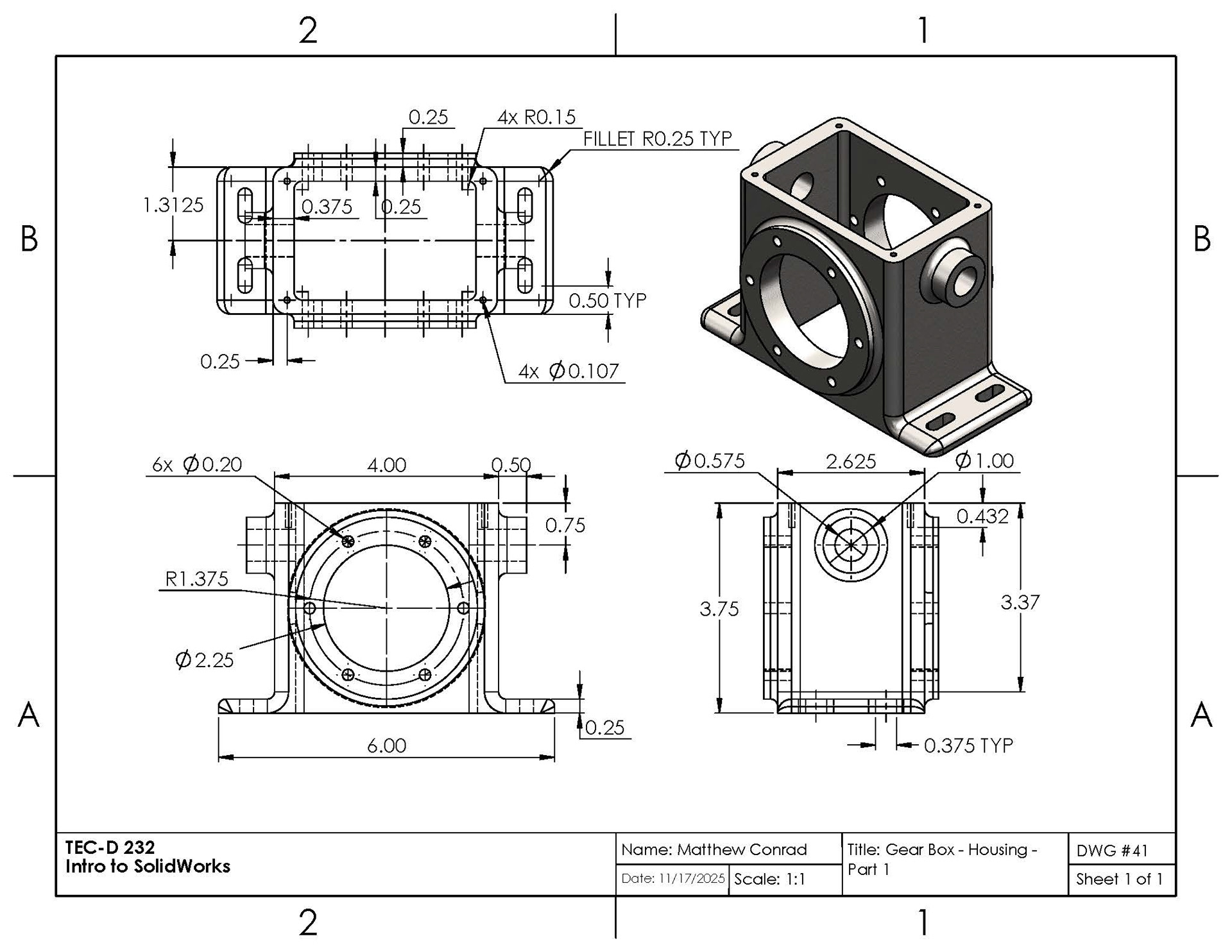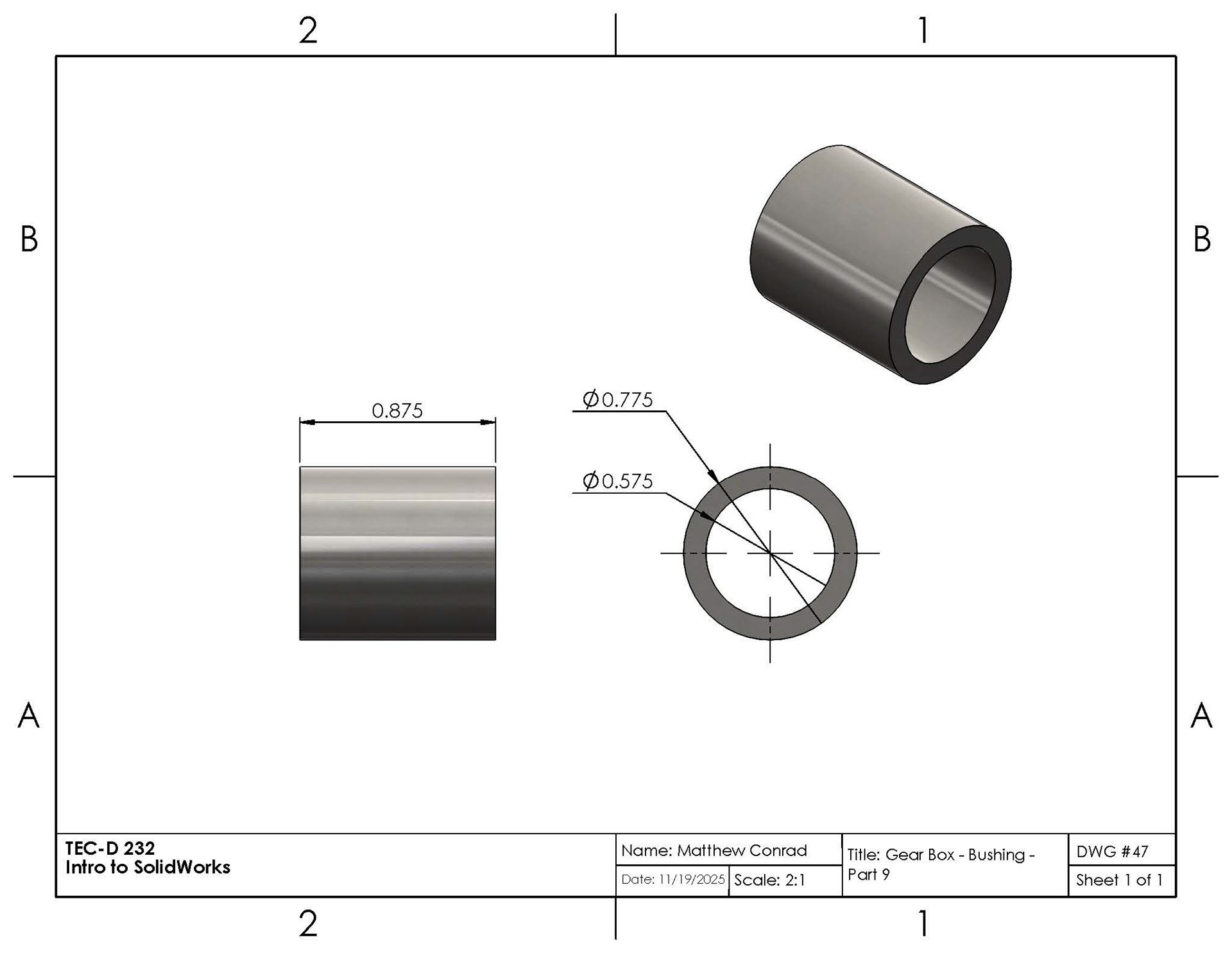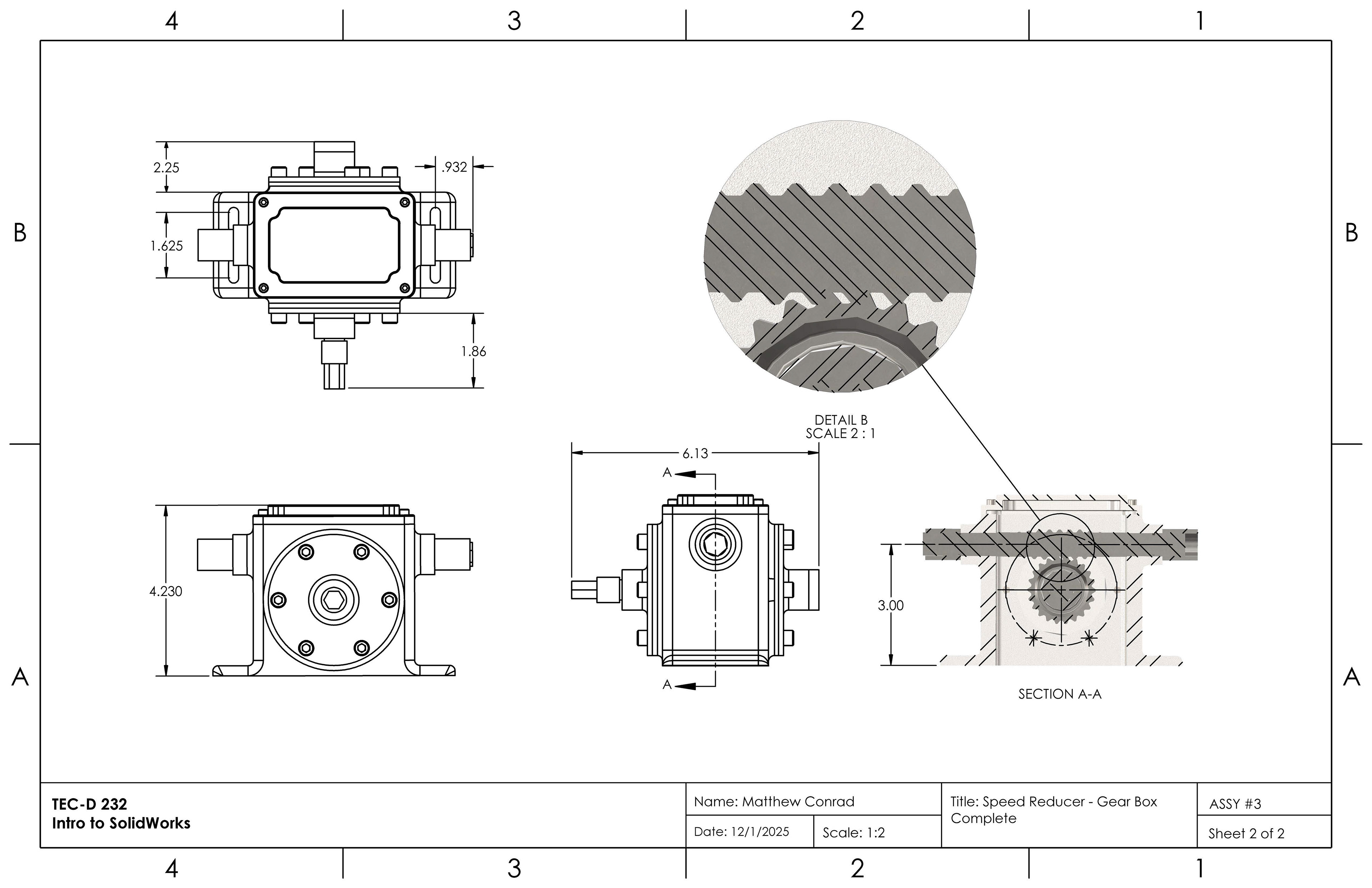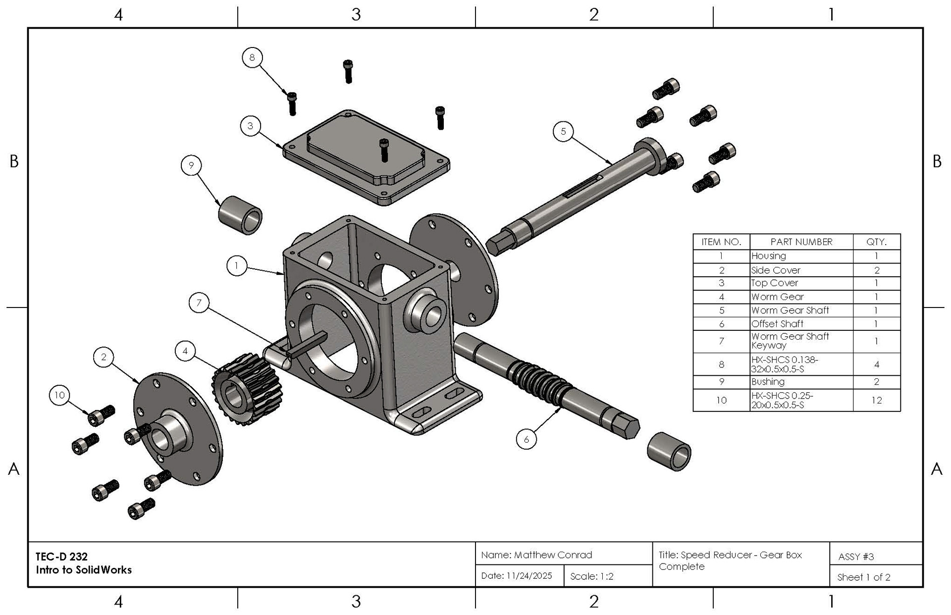 In this final project in the Introduction to SolidWorks course at Olympic College in Bremerton, WA, we had to create a gear reducer box comprised of ten different parts. Gear reducers, or speed reducers, are mechanical devices that decelerate power transmission from a motor to machinery.
