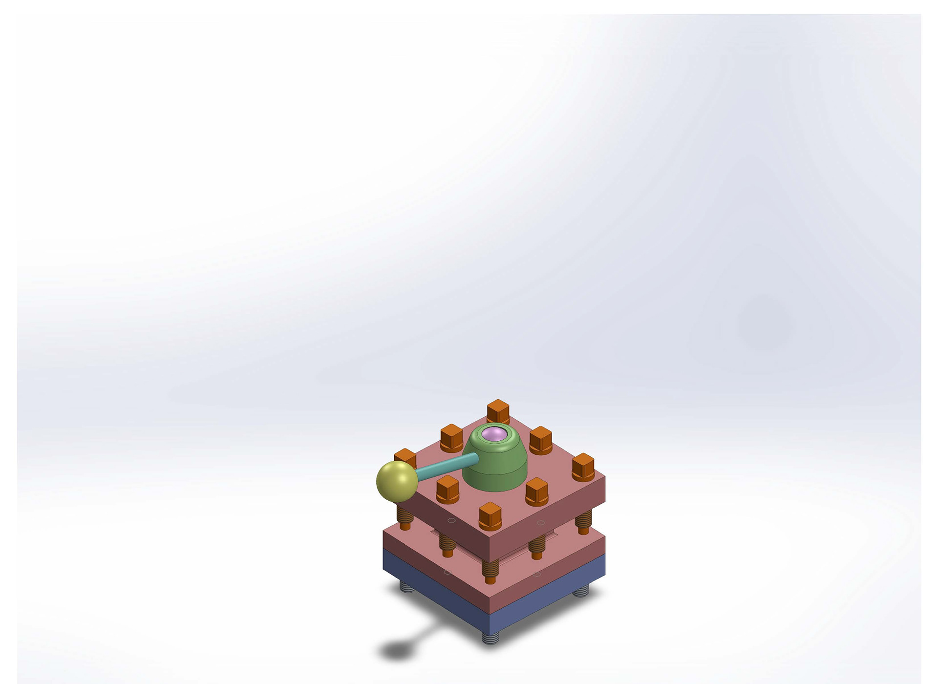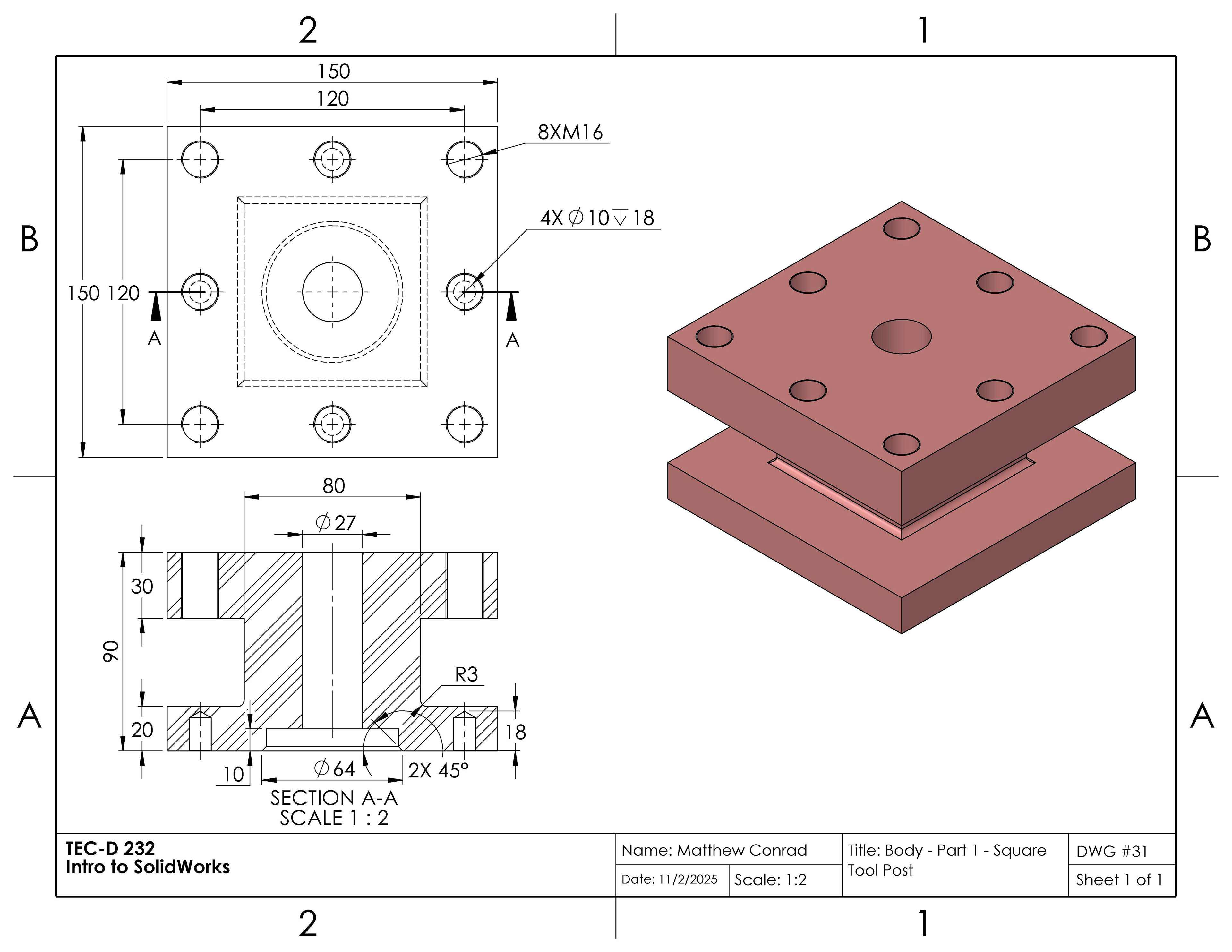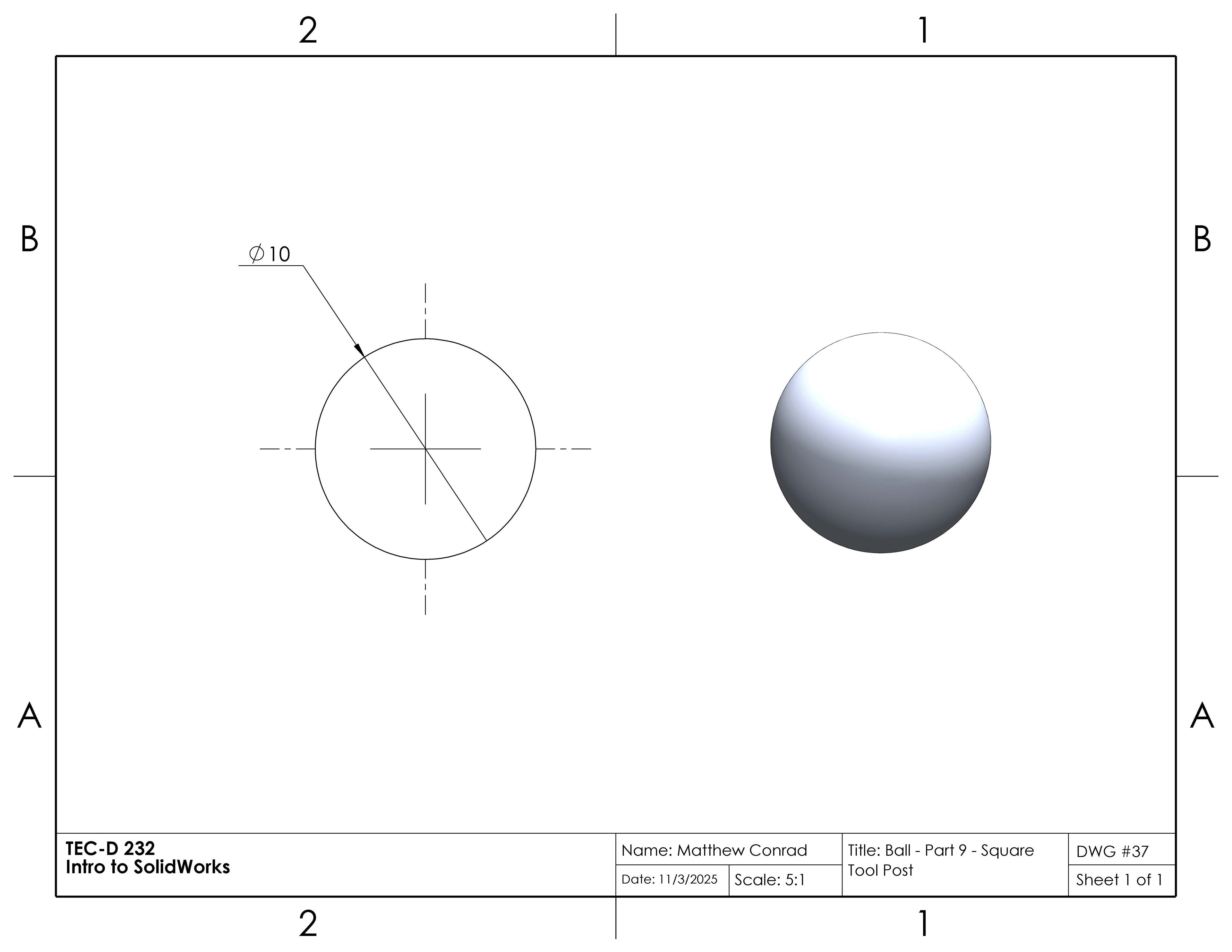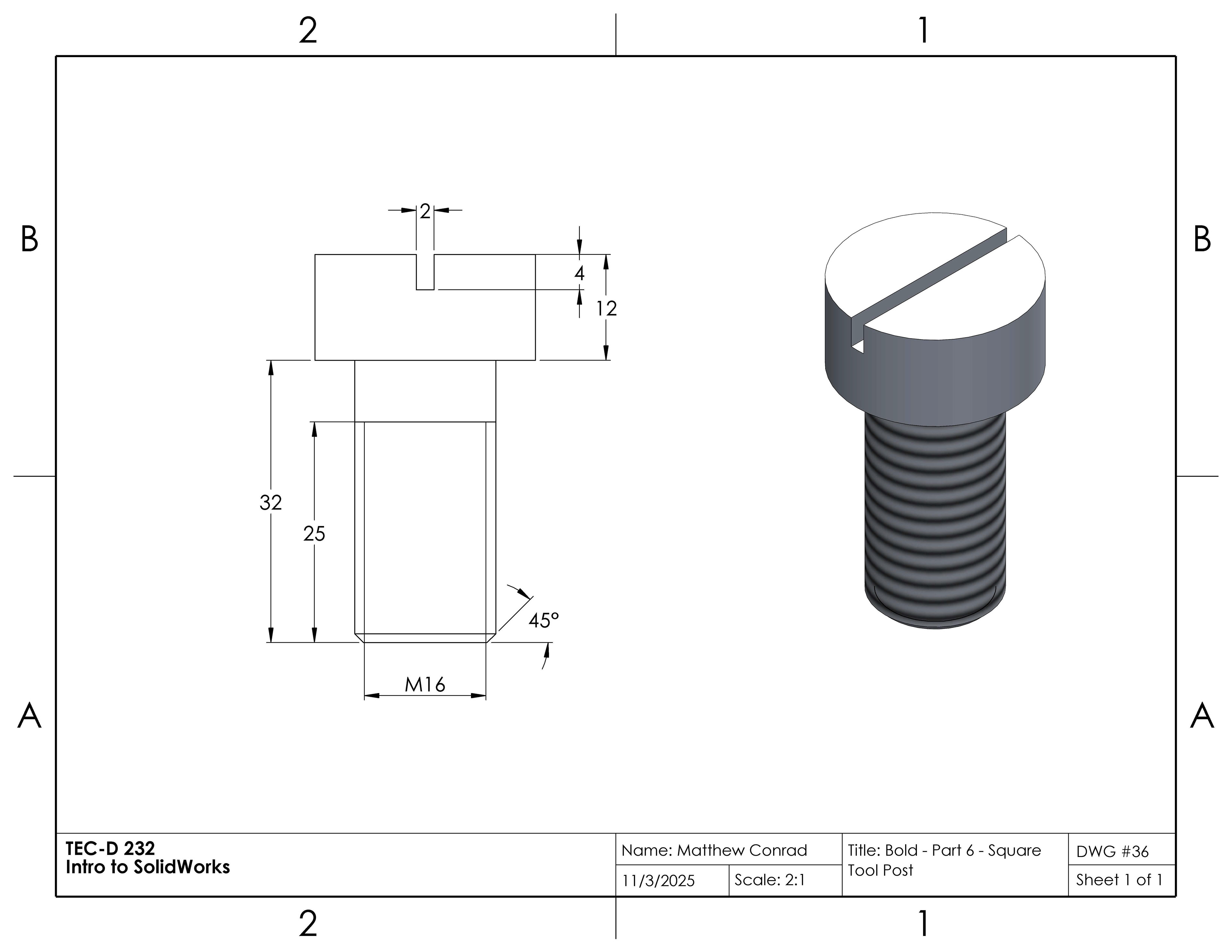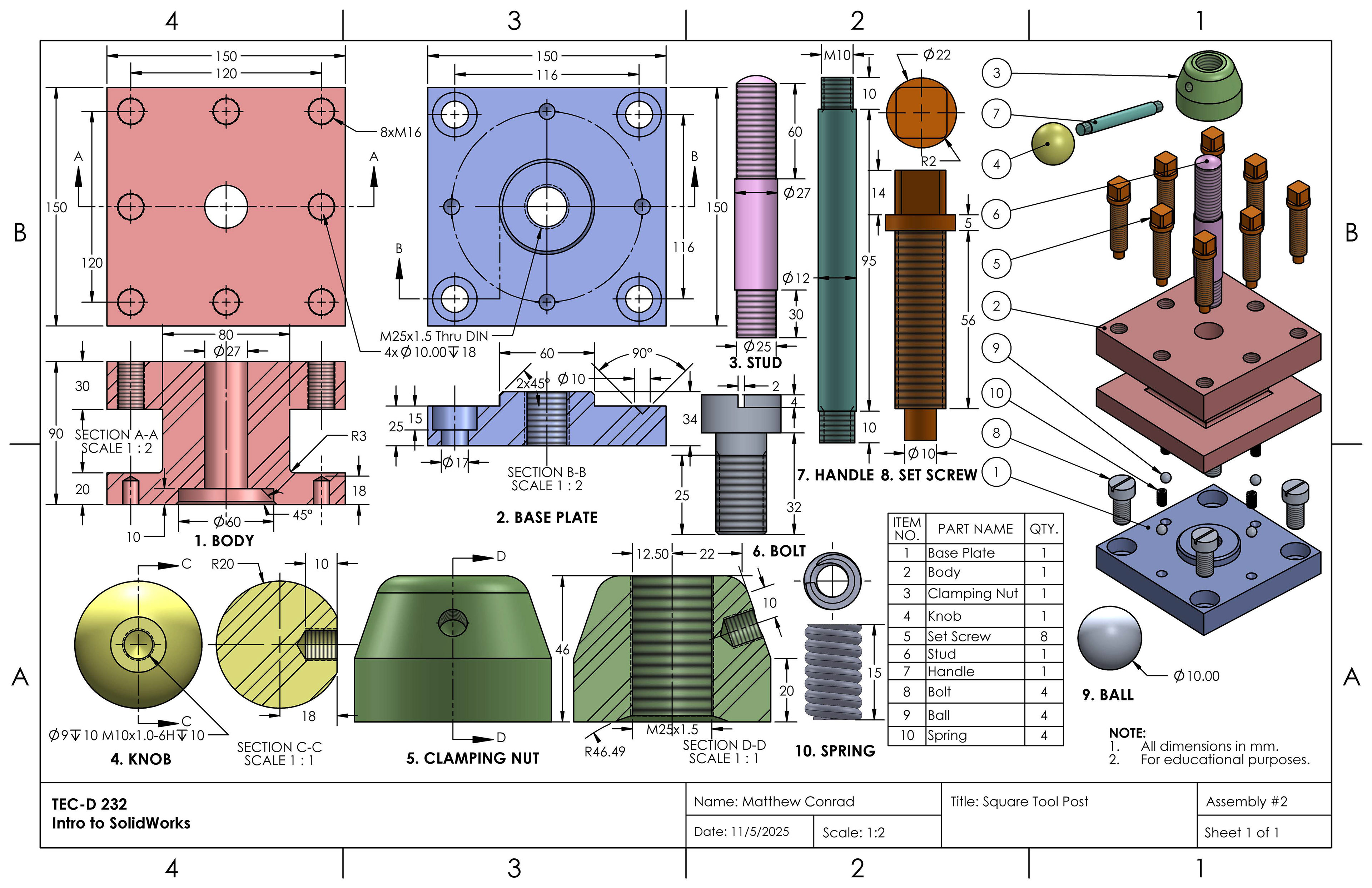 In this project in the Introduction to SolidWorks course, we were tasked to create a tool post in the shape of a square, assembled from multiple separate parts: a body, base plate, stud, knob, clamping nut, bolt, handle, set screws, and a ball & spring. The completed assembly drawing is at the very bottom of the page.