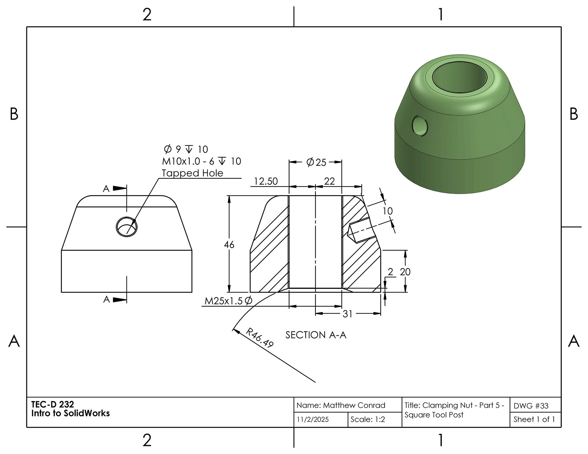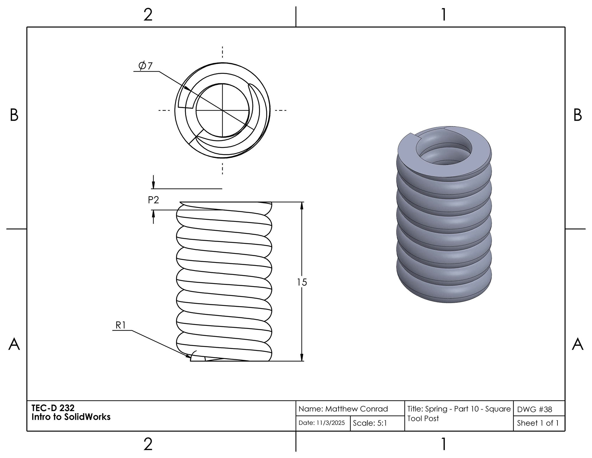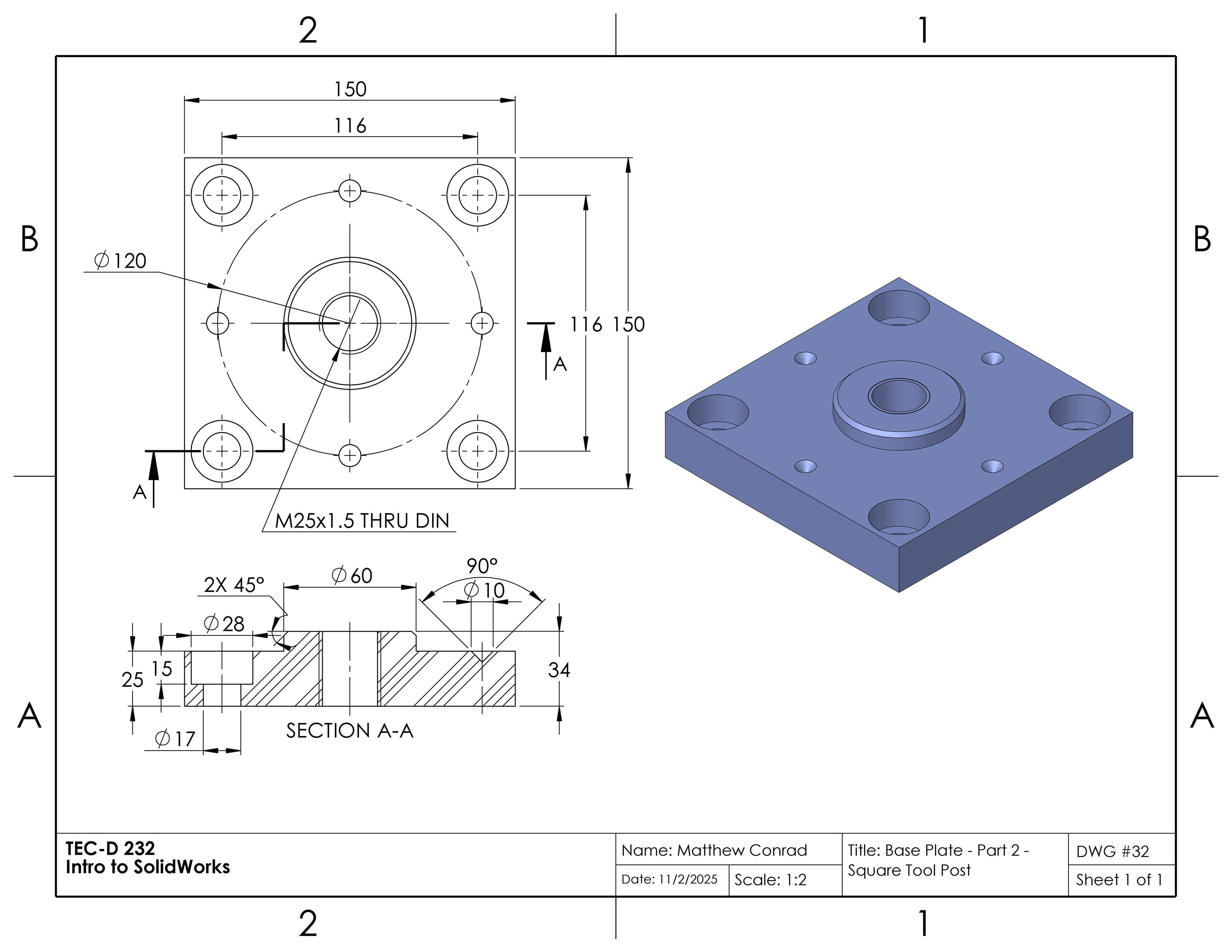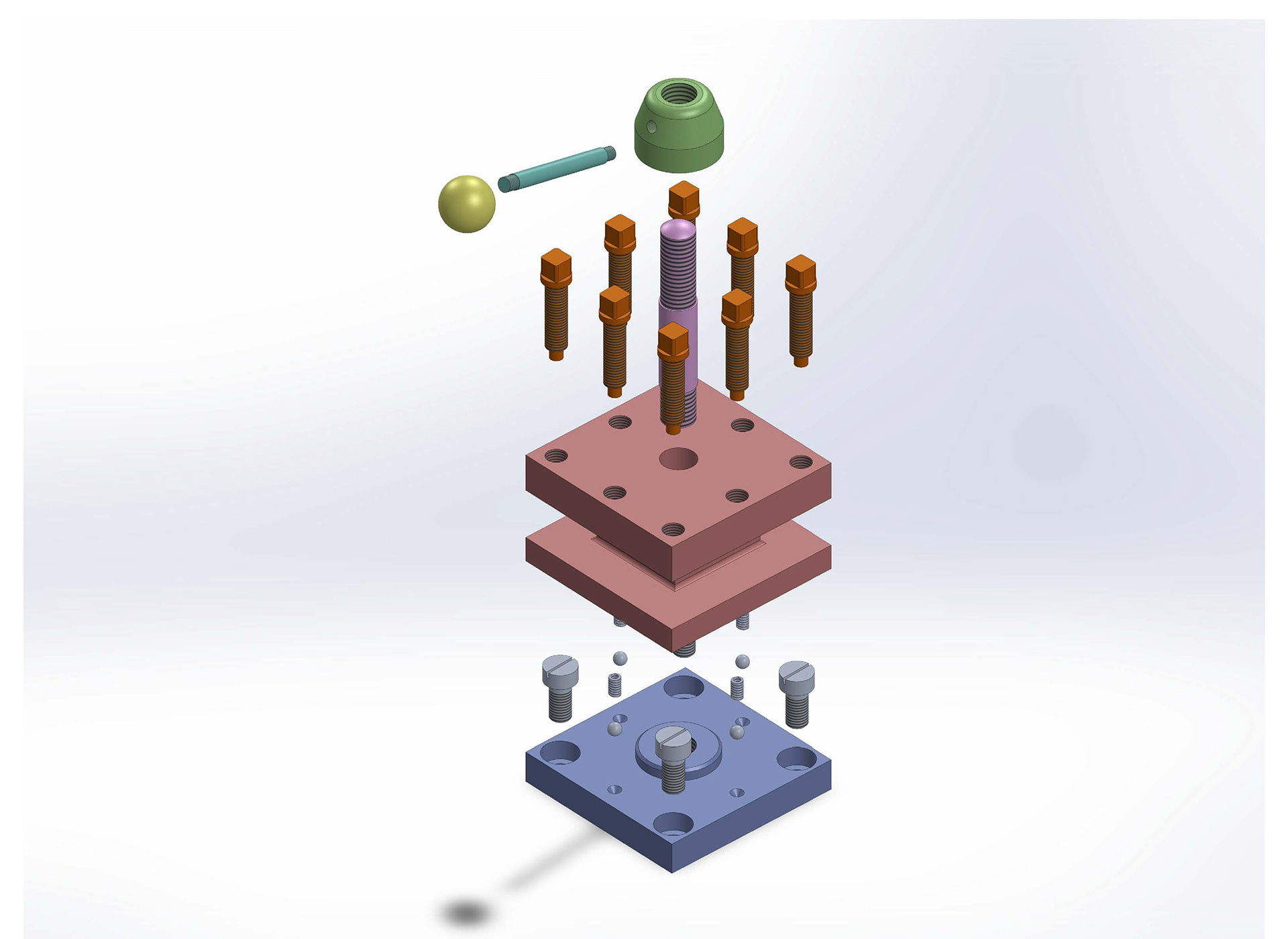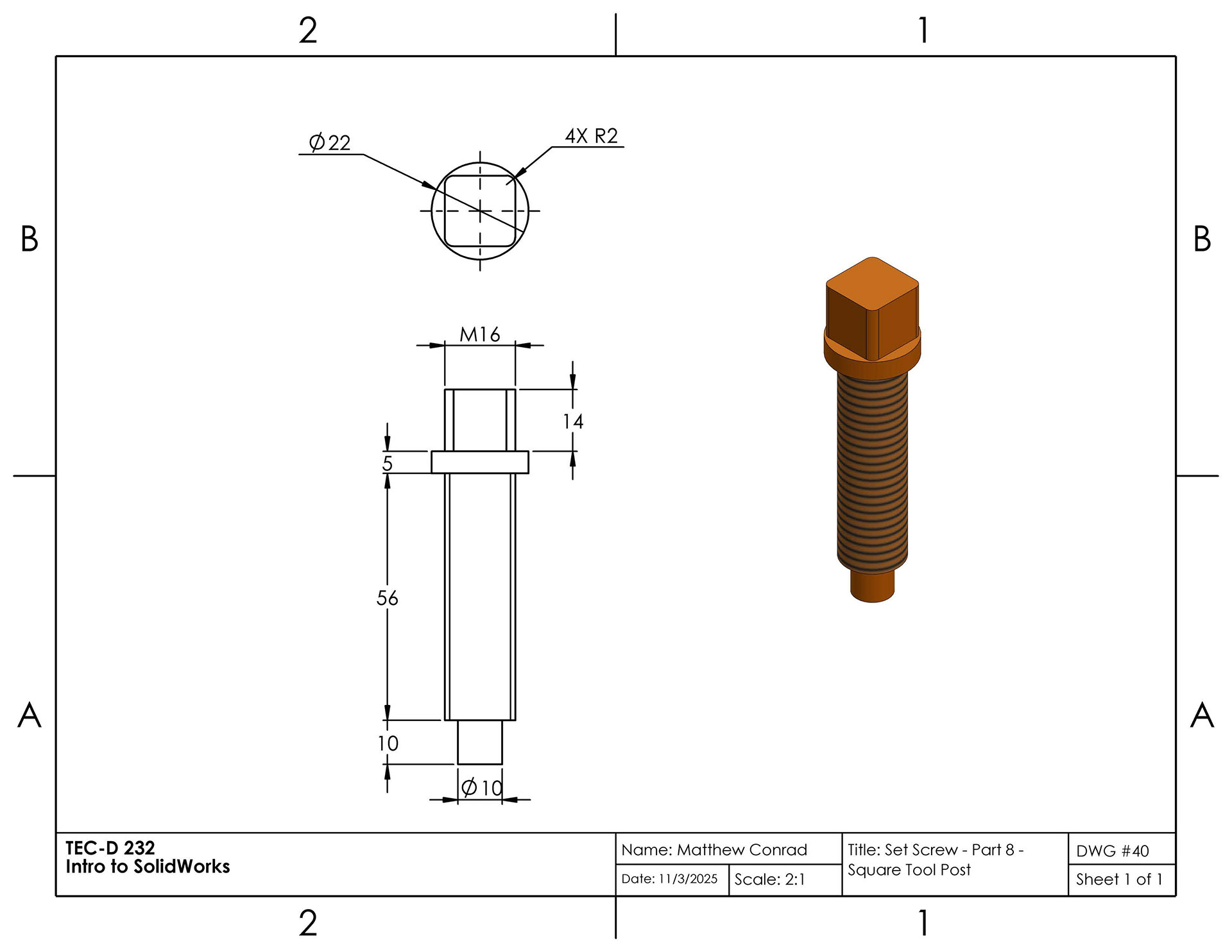 In this project in the Introduction to SolidWorks course, we were tasked to create a tool post in the shape of a square, assembled from multiple separate parts: a body, base plate, stud, knob, clamping nut, bolt, handle, set screws, and a ball & spring. The completed assembly drawing is at the very bottom of the page.